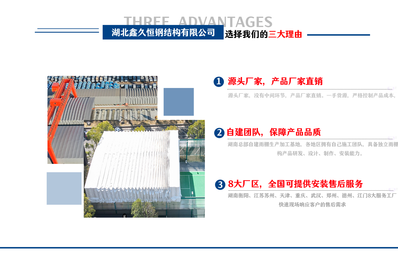 湖北鑫久恒鋼結(jié)構(gòu)有限公司是一家電動(dòng)雨棚、膜結(jié)構(gòu)車棚研發(fā),生產(chǎn)銷售,施工安裝于一體的專業(yè)鋼結(jié)構(gòu)科技公司,主要產(chǎn)品有伸縮雨棚,電動(dòng)雨棚,膜結(jié)構(gòu)車棚等。  湖南地區(qū)職員目前有80多人,占地面積20000平方米,廠房面積15600平方米,配備先進(jìn)的生產(chǎn)流水線,使每件品質(zhì)產(chǎn)品的堅(jiān)實(shí)基礎(chǔ)。  公司在蘇州、天津、重慶、武漢、德州、烏魯木齊、江門均設(shè)有服務(wù)工廠,總?cè)藛T共300多人,擁有專業(yè)的技術(shù)團(tuán)隊(duì),配備先進(jìn)的設(shè)備和流水線生產(chǎn),產(chǎn)能高,貨源充足,發(fā)貨速度快,服務(wù)區(qū)域廣。  移動(dòng)伸縮棚適用于通道臨時(shí)倉(cāng)儲(chǔ)、戶外運(yùn)動(dòng)遮陽(yáng)、污水池遮蓋、能源交通、熱力化工、礦山、船舶制造及市政建設(shè)、物流、碼頭等領(lǐng)域的構(gòu)件制作加工,成品半成品存放、倉(cāng)庫(kù)、野外儀器設(shè)備操作用房等。尤其是對(duì)工廠發(fā)貨、倉(cāng)儲(chǔ)臨時(shí)遮雨防嗮,梅雨期較長(zhǎng)、建設(shè)周期較短的工程施工等特別適用。還可根據(jù)用戶需求量身定制、適合企業(yè)所需不同款式的產(chǎn)品。  我公司堅(jiān)持“誠(chéng)信社會(huì)為本,客戶滿意為榮”的經(jīng)營(yíng)理念,做到質(zhì)量把控,嚴(yán)格管理,精益求精,恪守承諾。使鑫久恒逐步走向成熟,其系統(tǒng)化、專業(yè)化日趨完善。以專業(yè)的技術(shù)、科學(xué)的管理,更高的產(chǎn)品質(zhì)量,優(yōu)良的企業(yè)信譽(yù),真誠(chéng)的客戶服務(wù),靈活多樣的經(jīng)營(yíng)方式和務(wù)實(shí)創(chuàng)新的企業(yè)精神愿與社會(huì)各界攜手合作,為推動(dòng)智能鋼結(jié)構(gòu)建筑事業(yè)的發(fā)展而不斷努力。...